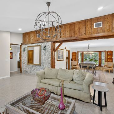 Natural wood and stone materials anchor the home with warmth and authenticity—an aesthetic that reads as quality the moment you step inside. Porcelain tile flooring runs throughout, tying each space together with a clean, durable finish that complements the home’s organic textures and bright, Florida-friendly palette.