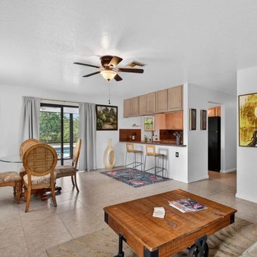 At its heart is a bright, open-concept kitchen, dining, and living space—welcoming, airy, and perfectly suited for relaxed entertaining or longer stays. The home is filled with natural light, and the indoor-outdoor connection is a defining feature: glass doors from the main living area, bathroom, and the bedroom all lead directly to a screened-in lanai that overlooks the pool and lush, tropical landscaping beyond. It’s the kind of setting that instantly slows the pace—where mornings begin with filtered sunlight and evenings settle into soft, breezy calm.